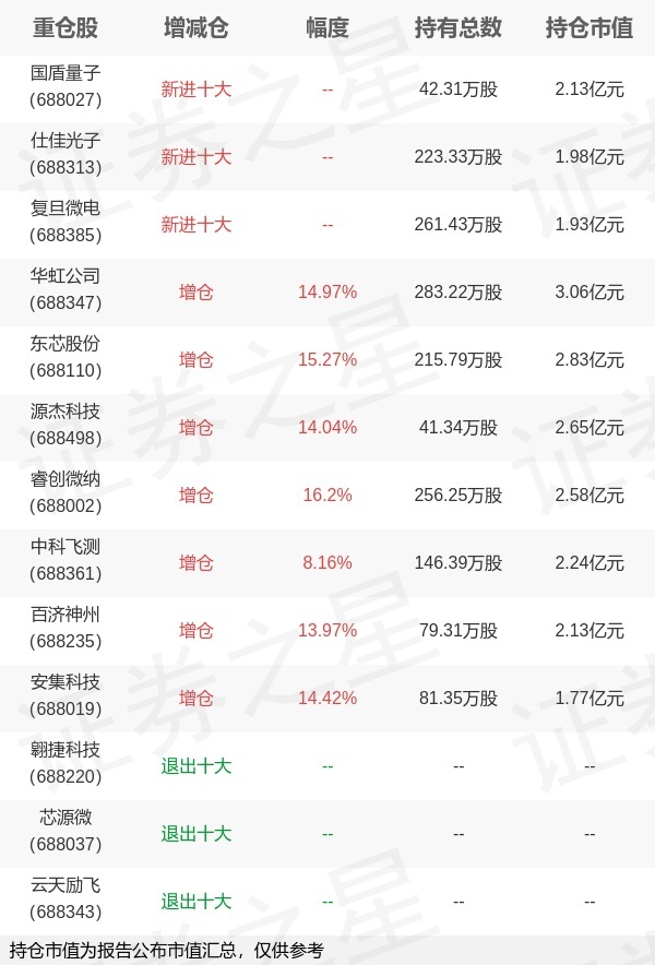 证券之星消息,1月21日鹏华基金旗下苏俊杰管理的鹏华上证科创板100交易型开放式指数基金公布年报,近1年净值增长率74.44%。与上一季度相比,该基金前十大重仓股新增国盾量子,仕佳光子,复旦微电;并对华虹公司增仓36.87万股,为该基金第一大重仓股;翱捷科技,芯源微,云天励飞等退出前十大重仓股;详细数据如下: