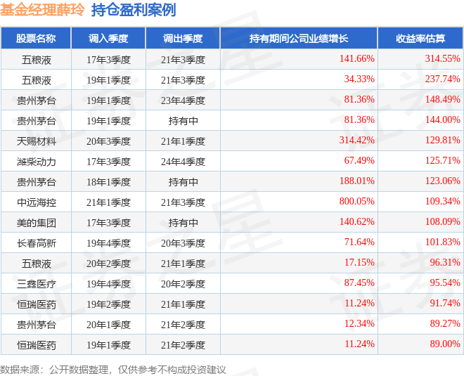 薛玲管理的建信深证基本面60ETF联接A基金在17年3季度买入五粮液,在持有4年又0个季度后在21年3季度卖出。持有期间的估算收益率为314.55%,持有期间五粮液在2017年到2021年的年报归属净利润增幅达141.66%。