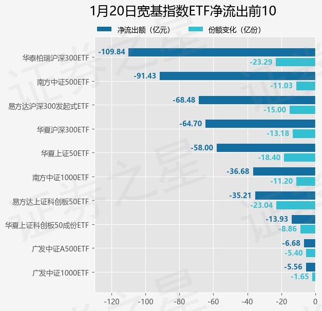 当日有77只宽基指数ETF基金出现资金净流出,其中净流出排首位的是华泰柏瑞沪深300ETF(510300),份额减少了23.29亿份,净流出额为109.84亿元。
