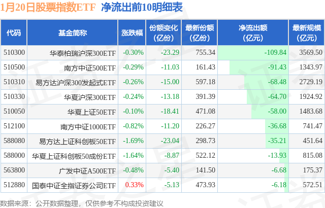 当日有230只股票指数ETF基金出现资金净流出,其中净流出排首位的是华泰柏瑞沪深300ETF(510300),份额减少了23.29亿份,净流出额为109.84亿元。