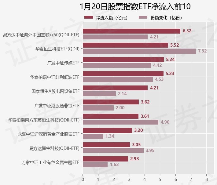 当日有237只股票指数ETF基金出现资金净流入,其中净流入排首位的是易方达中证海外中国互联网50(QDII-ETF)(513050),份额增加了4.21亿份,净流入额为6.32亿元。