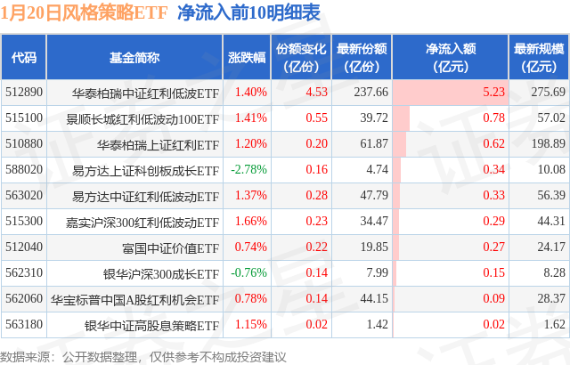 当日有12只风格策略ETF基金出现资金净流入,其中净流入排首位的是华泰柏瑞中证红利低波ETF(512890),份额增加了4.53亿份,净流入额为5.23亿元。