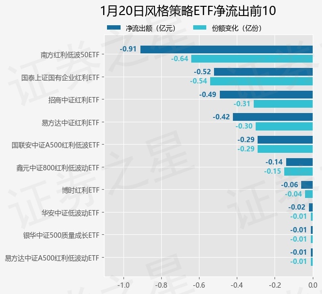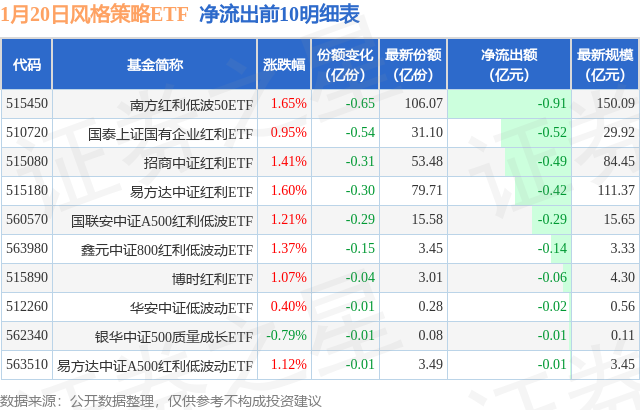 当日有13只风格策略ETF基金出现资金净流出,其中净流出排首位的是南方红利低波50ETF(515450),份额减少了6450.0万份,净流出额为9067.72万元。