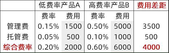 假设小夏分别持有100万综合费率为0.2%每年的低费率产品A和综合费率为0.6%每年的高费率产品B,一年下来,费率差距有整整4000元,显著降低了投资者的持仓成本。
