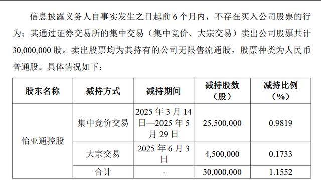 根据公告,在2025年11月17日至2026年1月5日期间,怡亚通控股通过集中竞价交易方式累计减持4,155,200股,占公司总股本的0.16%。本次减持后,其持股比例由10.16%降至10.00%,仍为公司第二大股东,且所持股份均为无限售条件流通股。此次减持符合公司于2025年10月22日预披露的计划。