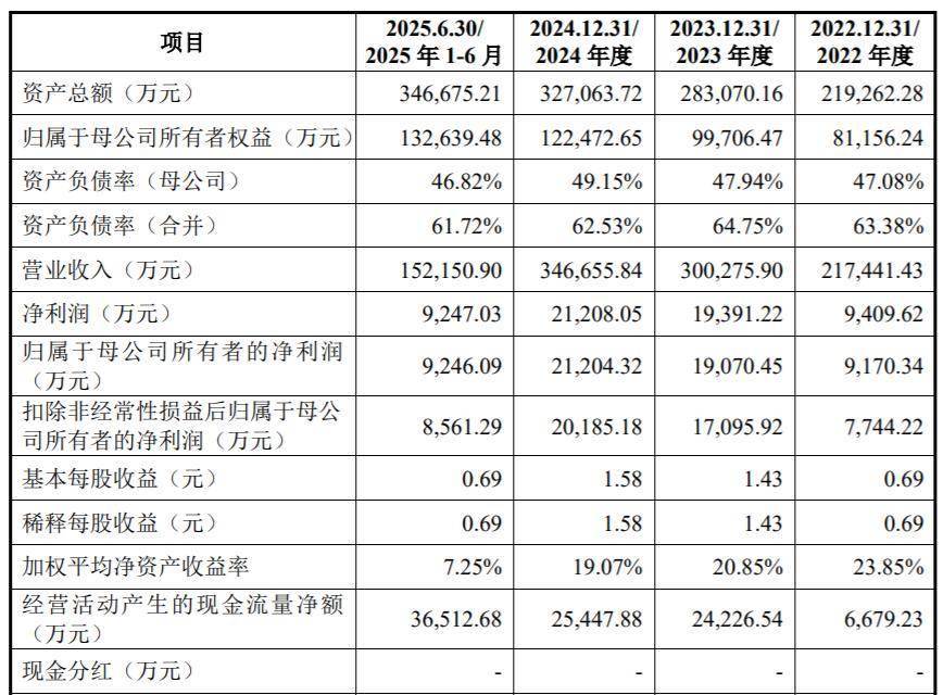 2022年至2024年及2025年上半年(报告期内),公司营业收入分别为21.74亿元、30.03亿元、34.67亿元和15.22亿元,归属于母公司股东的净利润分别为9170.34万元、1.91亿元、2.12亿元和9246.9万元。