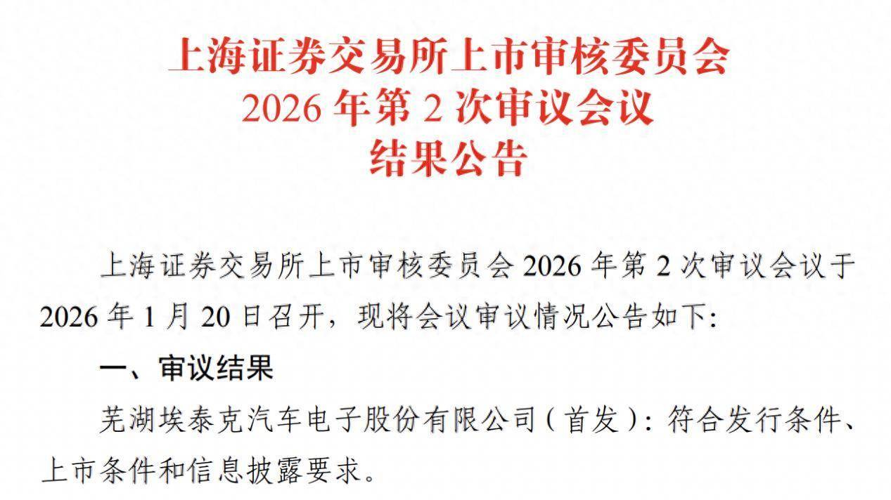 瑞财经 刘治颖 1月20日,据上交所披露,芜湖埃泰克汽车电子股份有限公司(以下简称:埃泰克)(首发)符合发行条件、上市条件和信息披露要求。