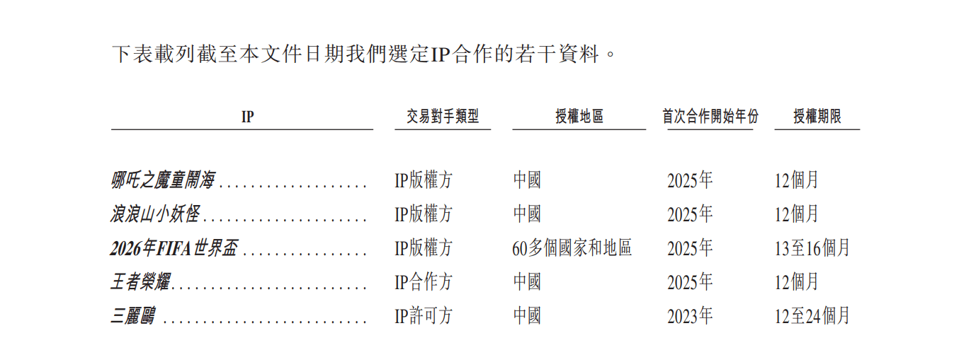 不仅是《哪吒2》的合作授权期限只有12个月,其他IP如《浪浪山小妖怪》《王者荣耀》等合作期限也都是12个月。公司列示的合作IP中,最长的合作期限只有24个月。