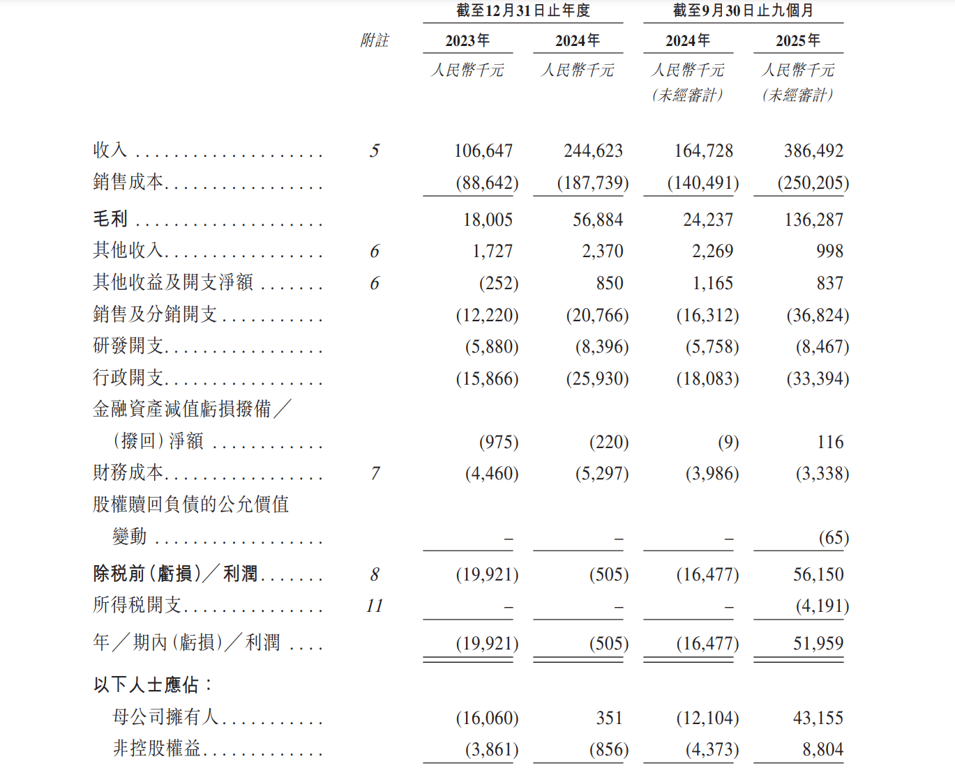 《财中社》注意到,桑尼森迪正迎来业绩爆发期。2023-2024以及2025年前三季度,公司实现营收1.1亿元、2.4亿元以及3.9亿元,2025年前三季度收入不仅超过2024年全年,更是上一年同期的2.3倍。