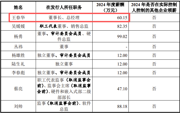 2024年度,公司实控人、董事长、总经理的薪酬为60.15万元。而销售总监吴媛媛、硬件总监杨勇、软件总监刘帅、设计部副经理韩春、副总经理宋海瑞、副总经理王晓峰、设计部经理欧阳翔、设计部副经理黄鹤