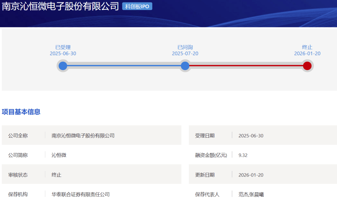 1月20日,上交所公布关于终止对南京沁恒微电子股份有限公司科创板IPO审核的决定,直接原因是公司及保荐机构华泰联合证券撤回申请文件。沁恒微成为2026年第二家被终止审核的科创板IPO公司。公司申报IPO于2025年6月30日获得受理,7月20日收到首轮问询,但未见公布问询回复。2022年、2023年、2024年及2025年上半年,公司实现扣非归母净利润分别为0.4895亿元、0.6289亿元、0.9724亿元及0.7910亿元。
