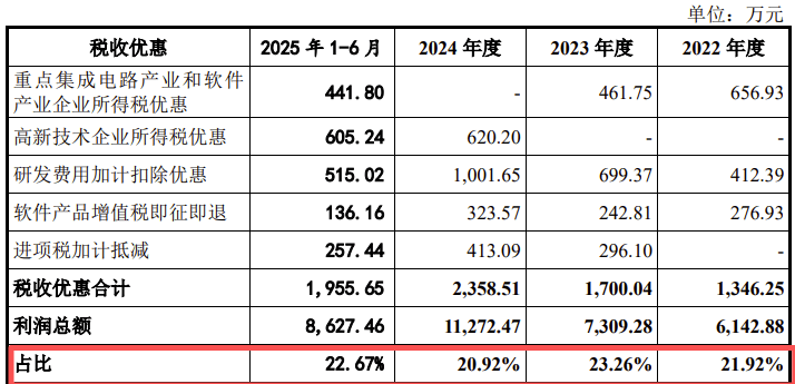 报告期内,公司主要享受税收优惠为重点集成电路产业和软件产业企业所得税优惠、高新技术企业所得税优惠、软件产品增值税即征即退、研发费用加计扣除优惠等,税收优惠金额及占利润总额比例情况如下: