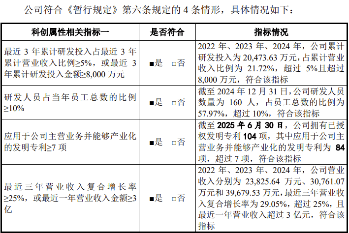 2022 年、2023 年、2024 年,公司累计研发投入为 20,473.63 万元,占累计营业收入比例为 21.72%。截至 2024 年 12 月 31 日,公司研发人员数量为 160 人,占员工总数的比例为57.97%。截至 2025 年 6 月 30 日,公司拥有已授权发明专利 104 项,其中应用于公司主营业务并能够产业化的发明专利为 84项。