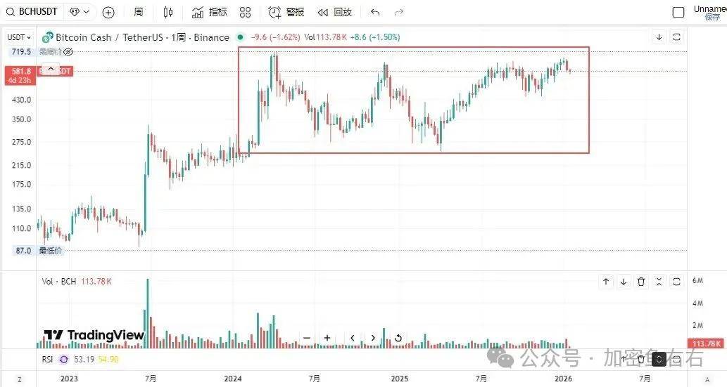 虽然2025年11月以来BCH又出现了一波上涨,突破了2025年9月高点,但是很快冲高回落,说明买盘枯竭,后继乏力。