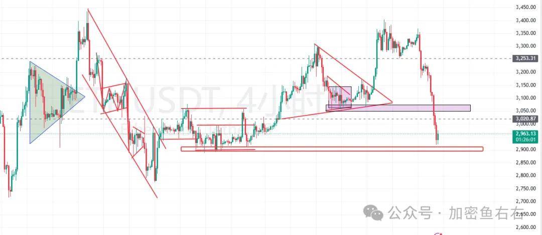 目前ETH价格已经来到了上波涨幅的起点位置,也是支撑附近,属于前期低点2900附近的支撑,关注这个位置能否守住