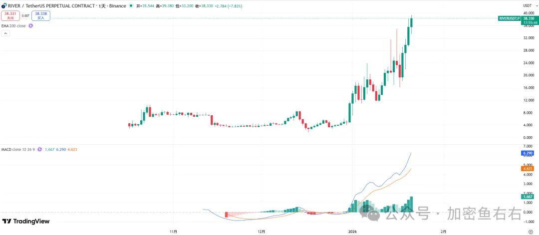RIVER明显到了顶部区域,不会再出现几倍的暴涨,但是不一定马上开始趋势性下跌。 现在适合小仓位低杠杆试仓做空,逐步加仓。 现在做空RIVER最大的问题是资金费率太坑,每天光资金费率都接近3%,做空成本太高了!