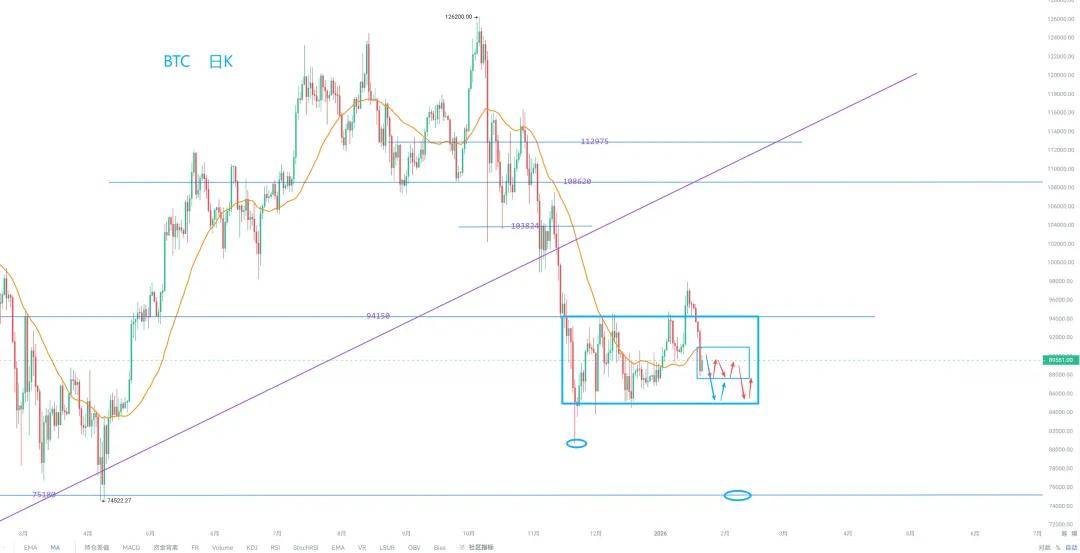比特币目前被市场定义为风险资产,根本就不是避险资产,所以这几天黄金疯涨,比特币跌跌不休。 目前已经在 88000 附近徘徊,这一波反弹宣告结束,接下来还会伴随宏观突发利空而回撤,继续下跌寻找关键支撑位置。