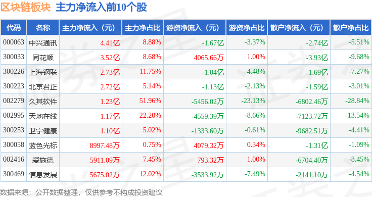 从资金流向上来看,当日区块链板块主力资金净流出31.8亿元,游资资金净流入6.08亿元,散户资金净流入25.72亿元。区块链板块个股资金流向见下表:
