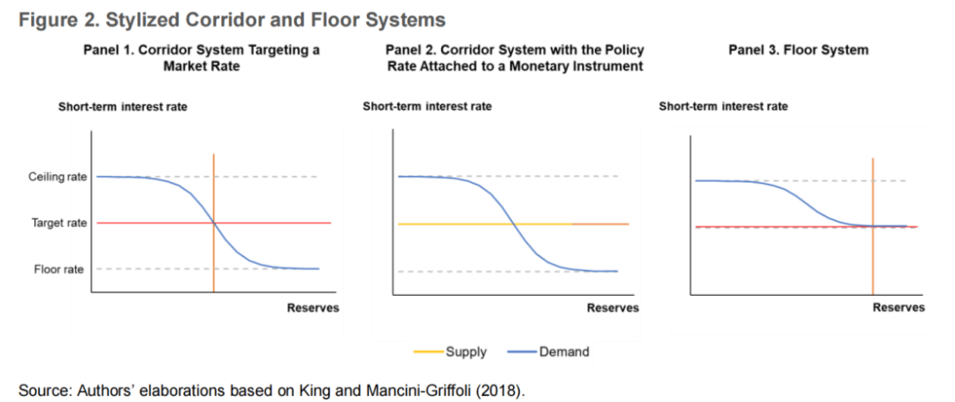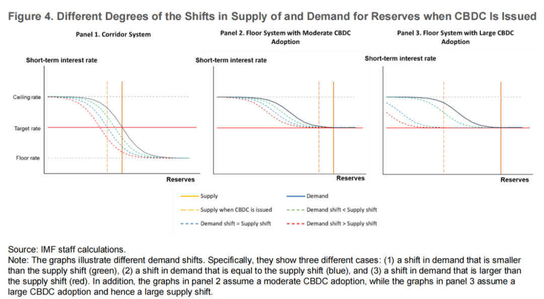情景二:可能显著影响短期利率,因为存款向CBDC转移会导致银行体系的准备金减少(供给曲线左移),同时银行因存款基础缩小,对准备金的需求也可能变化(需求曲线左移)。下图展示了在走廊体系和地板体系下,供给与需求曲线不同幅度移动对短期利率的潜在影响。在准备金稀缺的走廊系统中,若准备金需求降幅小于供给降幅,短期利率可能面临上行压力;在地板系统中,除非CBDC采用规模巨大导致准备金供给极度萎缩,否则利率受冲击较小。