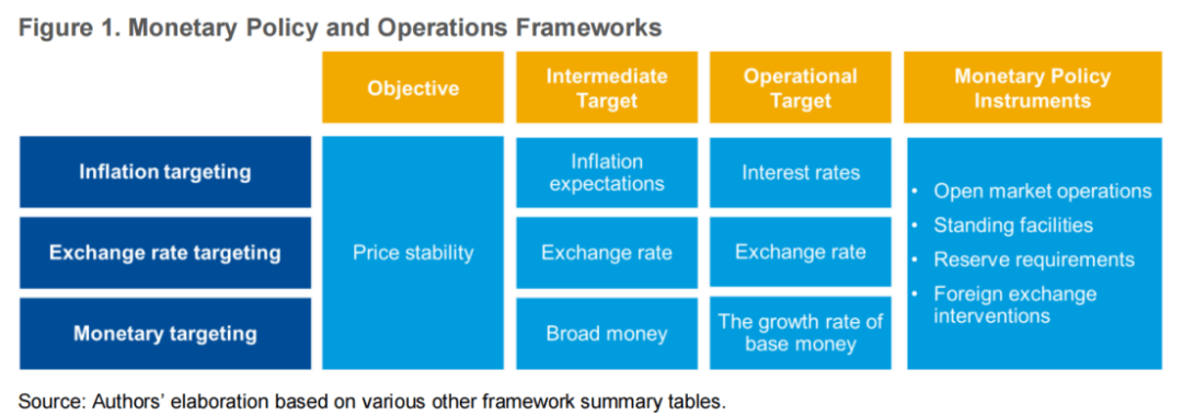 各国央行虽有不同目标,但其共同的长期政策目标是维持价格稳定。为实现此目标,它们可能采用不同的货币政策制度,主要包括:通胀目标制、汇率目标制和货币目标制。目前,多数主要发达经济体及新兴市场和发展中经济体采用通胀目标制,而许多高度依赖国际贸易与投资的小型开放经济体则选择汇率目标制,货币目标制已较少采用。
