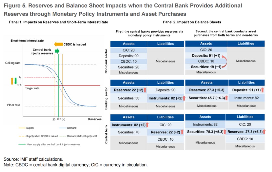 情景三:如果CBDC在监管待遇、计息和准入方面与准备金等同,则短期利率不会受到显著影响。银行持有的央行货币总量不变,只是央行负债结构发生变化。