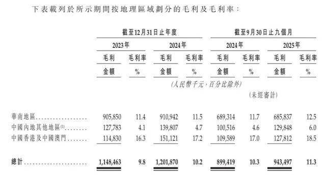 而公司在内地其他区域的毛利率明显低于大湾区,内地其他区域各期的毛利率分别为4.1%、4.7%、6%。