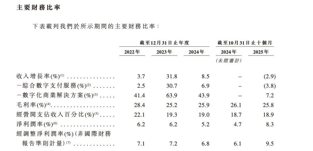 招股书披露,2022年、2023年、2024年和2025年前10个月,富友支付的毛利率分别为28.4%、25.2%、25.9%、25.8%。富友支付表示,毛利率由2022年的28.4% 降至2023年的25.2%,主要是由于中国境内的支付服务竞争加剧,境内支付服务的毛利率已经由2022年的23.1%下降至21.1%,随着交易量增加,收单服务的佣金增加,作为加强渠道合作伙伴的定价策略的一部分,公司提高了若干渠道伙伴2023年佣金率。