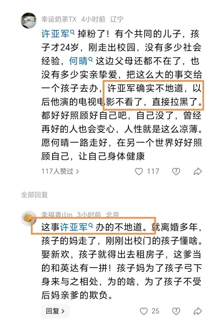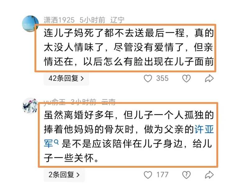 很多网友责怪许亚军,说他太不懂人情味了,一日夫妻百日恩,这个道理不懂吗,又不是有多大仇恨离的婚,看在孩子的份上也应该推掉一切事情去参加葬礼的,送最后一程。而且大大方方的去,老百姓还认可你,现在自己把好牌打坏了。老百姓的话太不地道了。