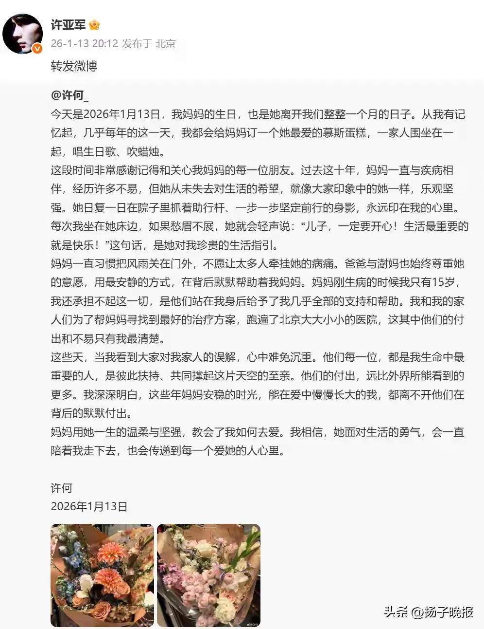 何晴的儿子,许何,在母亲去世后发布了一篇长文来悼念她。而何晴的前夫——许亚军,也转发了这篇微博,回应了儿子的悼文,借此机会实现了口碑的逆袭。许何的发文中透露了三个关键信息,似乎是在为父亲和继母张澍洗白。首先,1月13日是母亲的生日,也就是何晴62岁的冥寿。以往,每年这一天,家人都会为她定一个慕斯蛋糕,唱生日歌,吹蜡烛。文章中没有明确提到是否包括父亲和继母,言外之意似乎有所保留。其次,许何在文中回忆道,母亲是那么温柔又坚强。她在生病时,自己才15岁,而正是父亲与继母张澍共同努力,带母亲寻求医生治疗。第三,许何提到,外界对他们的误解让他感到非常沉重。母亲希望以一种安静的方式离开,而父亲和继母也尊重她的决定。