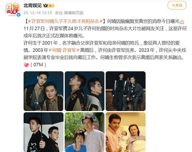 从当年冲破世俗的相恋,到和平分手共同抚育孩子,再到如今儿子成年亮相、斯人已逝,何晴与许亚军的故事,似乎提供了一种不同于狗血剧的离婚样本。它关乎爱情的生灭,更关乎亲情与责任在关系变化后的存续。当大众还在为“意难平”唏嘘时,当事人或许早已用时间和体面,给出了自己的答案。何晴的离世,让这段往事再度被提起,而那个名为“许何”的年轻人,则成了这段复杂往事最平静的见证与延续。