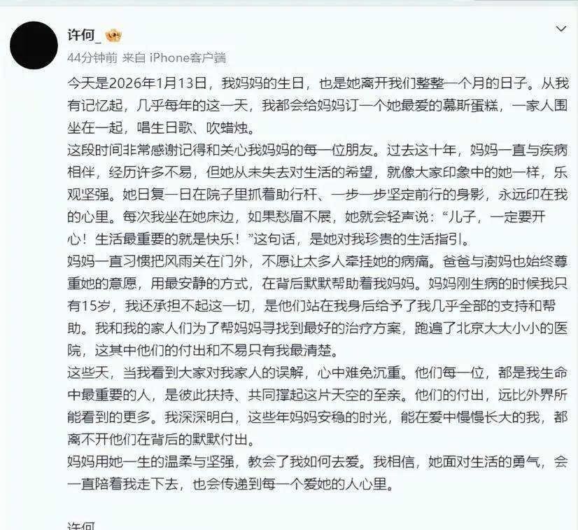 差不多同一时间,北京这边,何晴与许亚军的儿子许何晚上八点发了篇长文,字里行间全是泪点。24岁的小伙子记得每年这天要给妈妈订慕斯蛋糕,记得妈妈抓着助行杆在院子里练习走路的模样,更记得病床前那句 “儿子要开心” 的叮嘱。