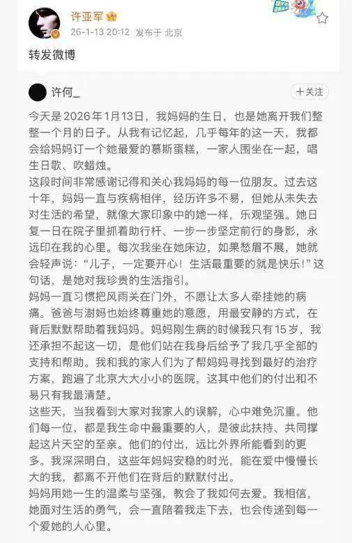 最让人动容的是,他特地提了句:妈妈生病十年,自己15岁时根本扛不住,全靠爸爸许亚军和继母张澍跑遍北京医院找方案,“他们的付出比外界看到的多太多”。