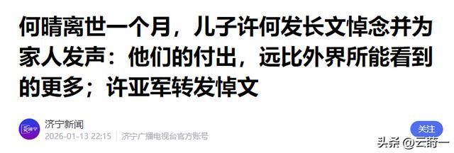 一个月前,荧幕“古典美人”何晴辞世,前夫许亚军葬礼缺席,当时舆论炸锅、骂声一片。