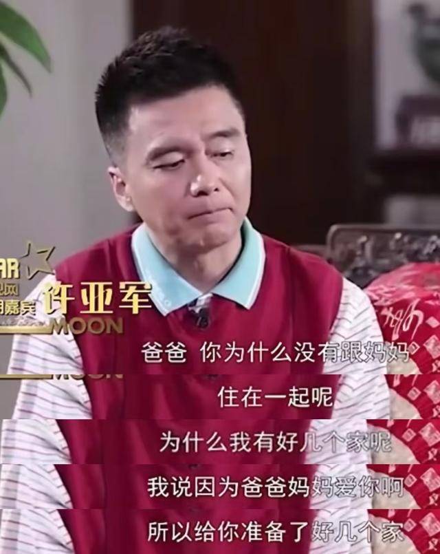等许何六七岁的时候,已经知道了离婚是什么,直接问许亚军两人为什么分开,许亚军说:“可能是爸爸不好,爸爸让妈妈不开心了,爸爸和妈妈分开,就是希望妈妈能够更幸福、更好、更快乐。”