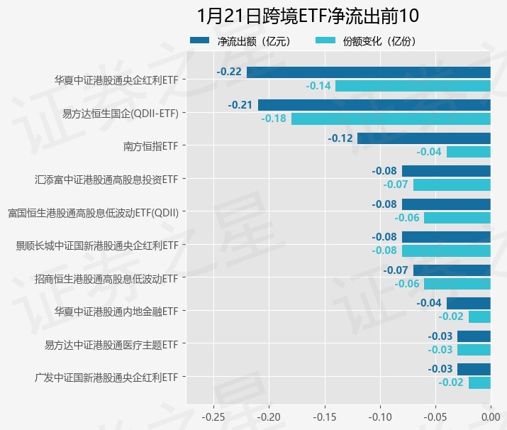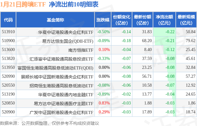 当日有25只跨境ETF基金出现资金净流出,其中净流出排首位的是华夏中证港股通央企红利ETF(513910),份额减少了1400.0万份,净流出额为2211.11万元。