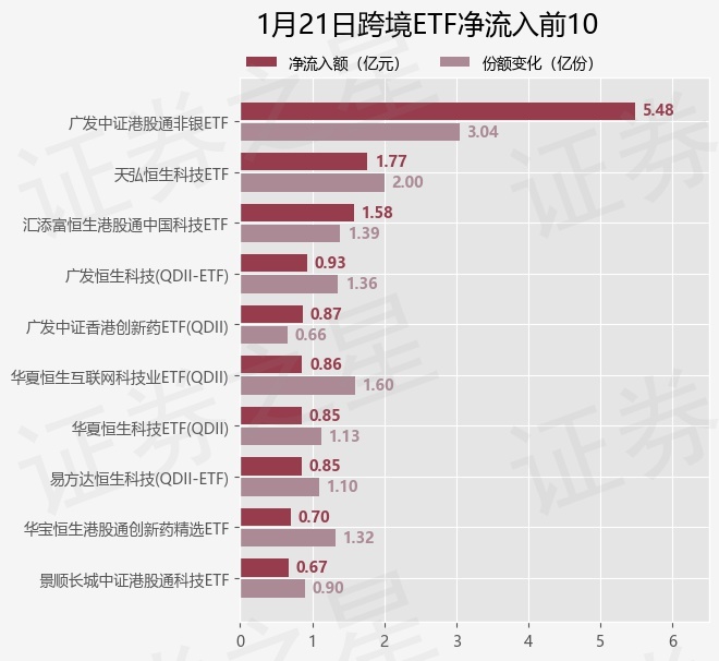 当日有38只跨境ETF基金出现资金净流入,其中净流入排首位的是广发中证港股通非银ETF(513750),份额增加了3.04亿份,净流入额为5.48亿元。