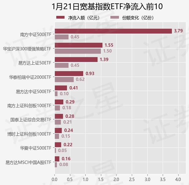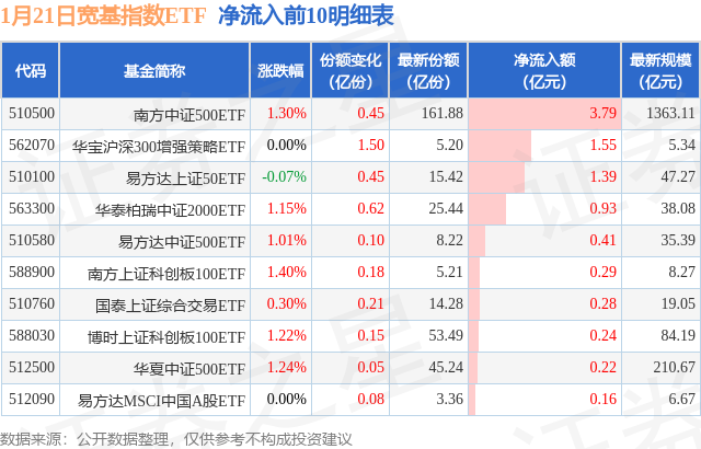 当日有37只宽基指数ETF基金出现资金净流入,其中净流入排首位的是南方中证500ETF(510500),份额增加了4520.0万份,净流入额为3.79亿元。