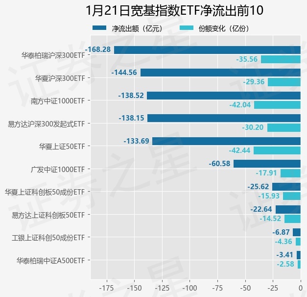 当日有79只宽基指数ETF基金出现资金净流出,其中净流出排首位的是华泰柏瑞沪深300ETF(510300),份额减少了35.56亿份,净流出额为168.28亿元。