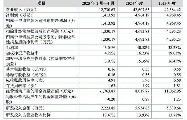 2023年-2024年及2025年前4个月,泽天春来实现营收分别为4.24亿元、4.26亿元、1.27亿元;归母净利润分别为4968.45万元、4964.19万元、1413.92万元。