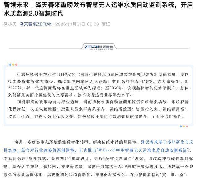 值得一提的是,1月21日,据泽天春来官微发布,为进一步落实生态环境监测数智化转型,解决传统水站的局限性,泽天春来基于多年研发与应用经验,结合对行业趋势的深刻洞察,正式推出“WDet-9000型智慧无人运维水质自动监测系统”。