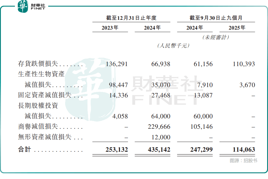 君乐宝的资产减值损失包括存货跌价损失、生产性生物资产减值损失、固定资产减值损失、长期股权投资减值损失、商誉减值损失,以及无形资产减值损失。而在2023年、2024年及2025年前三季度,君乐宝均产生了资产减值损失,其中商誉减值方面值得重点关注,经过2024年减值之后,截至2025年9月末,其账上商誉仍超过5亿元。
