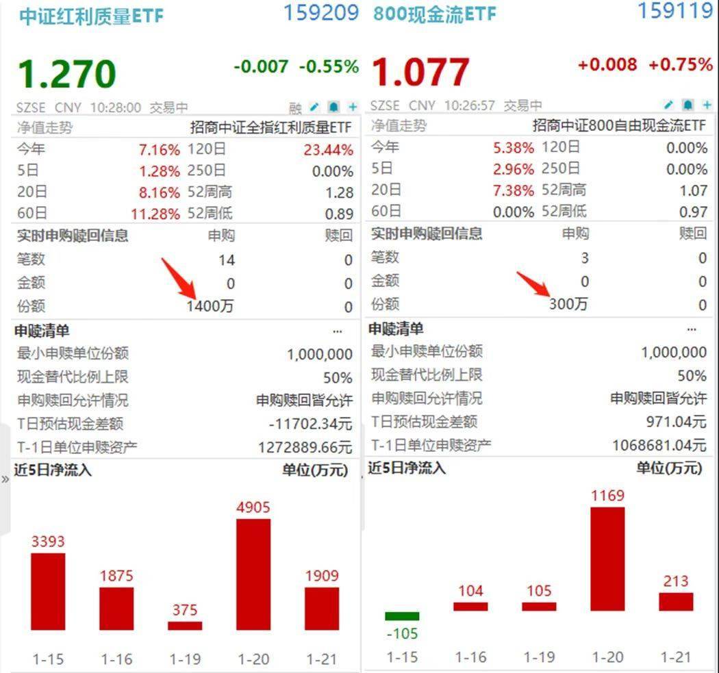 1月22日,两市平盘震荡。截至10时35分,中证红利质量ETF(159209)、800现金流ETF(159119)分别跌0.63%、0.75%,年内分别涨7.08%、5.38%。盘中溢价频现,资金低位布局意图明显。