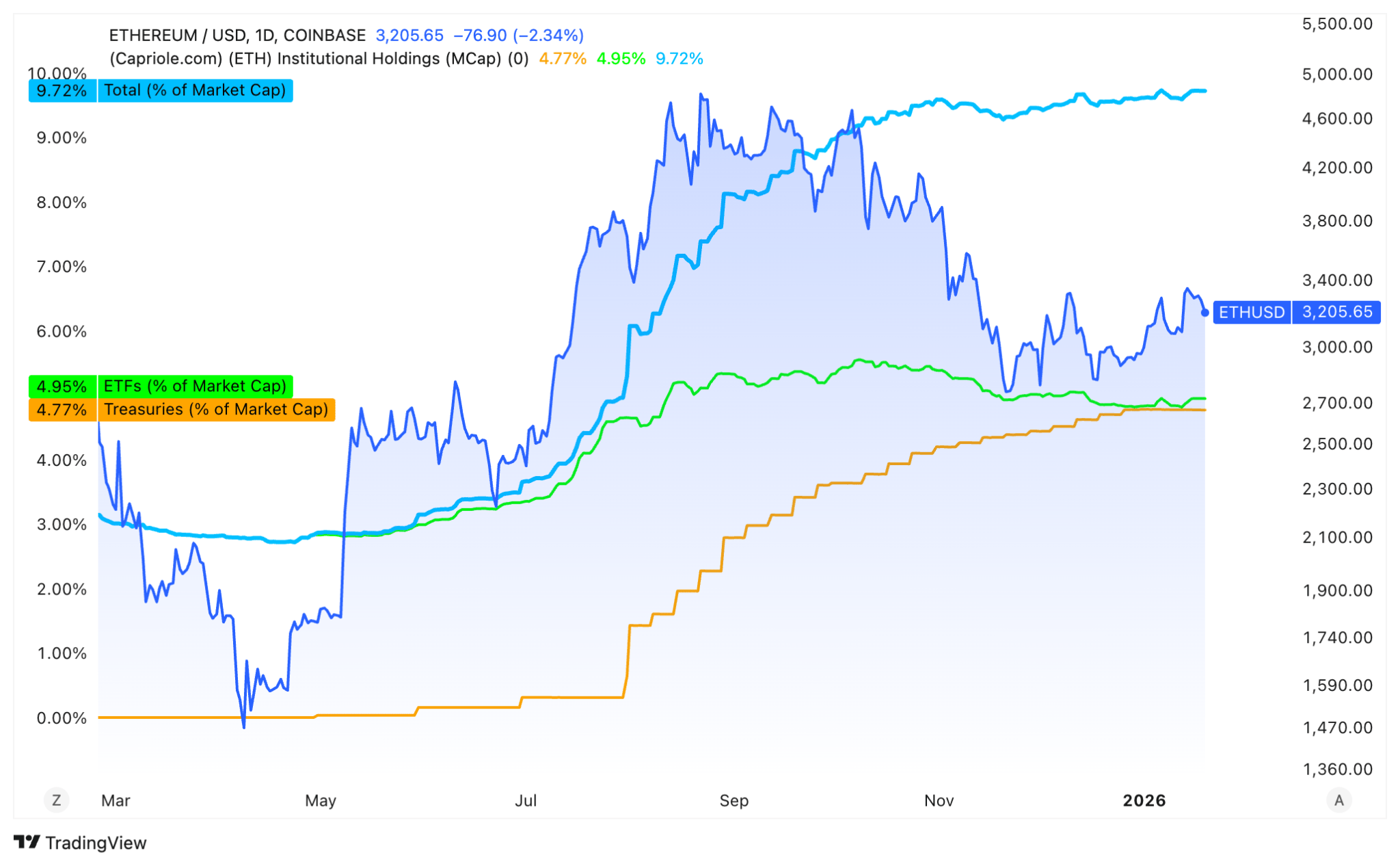 以太币财库和ETF持仓储备。来源:Capriole Investments