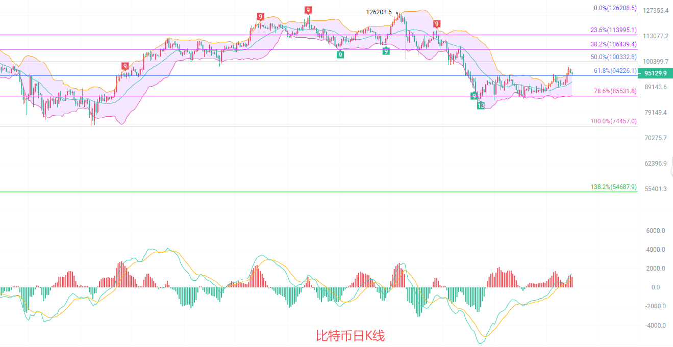 日K线发稿前,最高95800,最低94200,EMA趋势指标,依旧在收缩,按照目前收缩趋势,EMA趋势指标将会在黄金分割线0.618一线形成密集区,暂时定义为强支撑,MACD连续放量,DIF和DEA向上开口多头趋势不变,K线连续两天都在布林带上行通道横盘,上轨关注97000,中轨参考91500,思路上北上趋势不变
