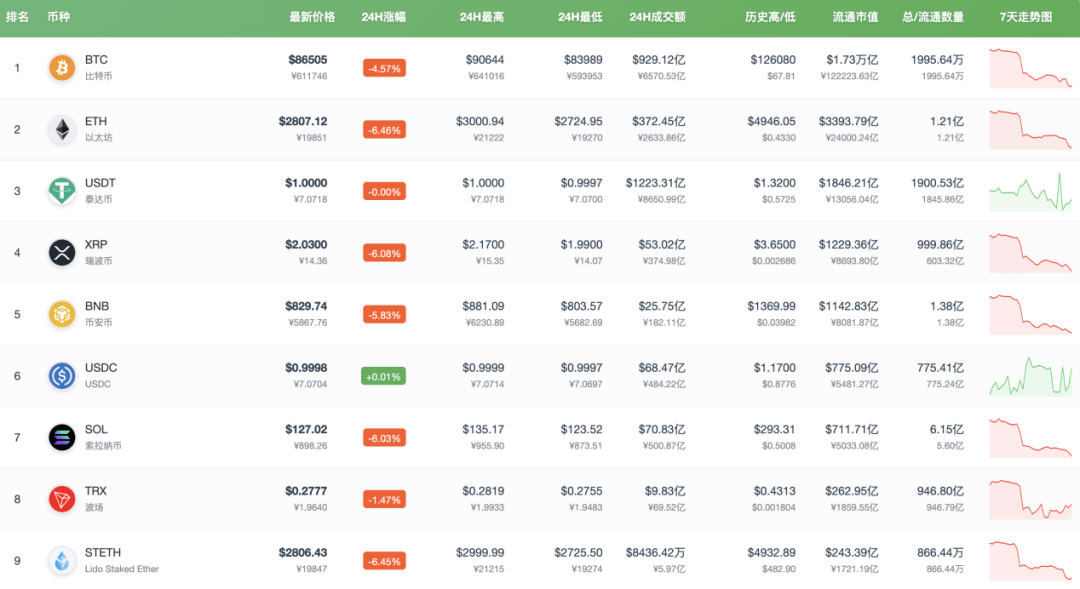 此外,XRP、BNB、索拉纳币均跌超6%。