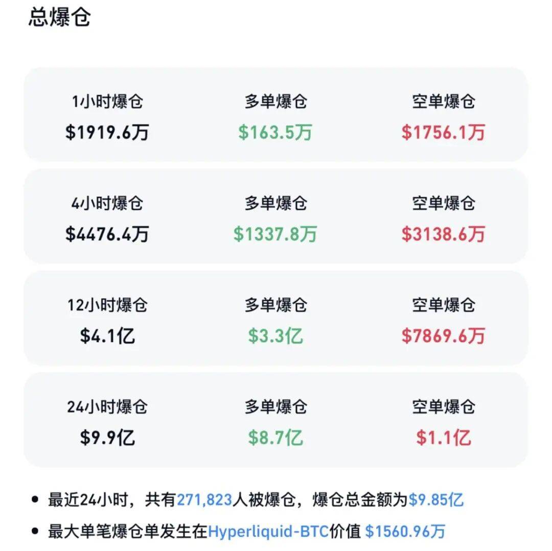 Coinglass数据显示,过去24小时加密货币市场共有超27万人被爆仓,爆仓总金额为9.85亿美元,其中多单爆仓8.7亿美元,空单爆仓1.1亿美元。