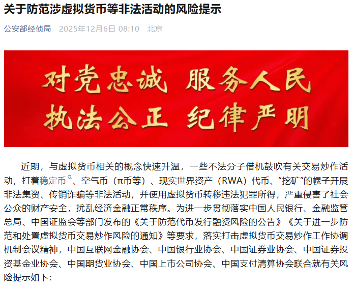 虚拟货币价格大起大落,波动剧烈,常被用于投机炒作和传销诈骗等非法活动,请社会公众切实增强风险意识和识别能力,守护好自己的“钱袋子”,切勿参与虚拟货币、现实世界资产代币相关活动,以及借虚拟货币“挖矿”名义开展的非法集资和非法发行证券活动。远离虚拟货币、现实世界资产代币,以免卷入相关违法犯罪活动,谨防加入推广虚拟货币、现实世界资产代币业务活动的社群,警惕含有虚拟货币、现实世界资产代币历史收益、买卖建议或投机前景的虚假宣传,拒绝点击含有境外虚拟货币、现实世界资产代币交易平台的链接及二维码等访问渠道。如发现任何涉及虚拟货币、现实世界资产代币相关业务活动的线索,及时向有关监管部门举报,对其中涉嫌违法犯罪的,及时向公安机关报案。
