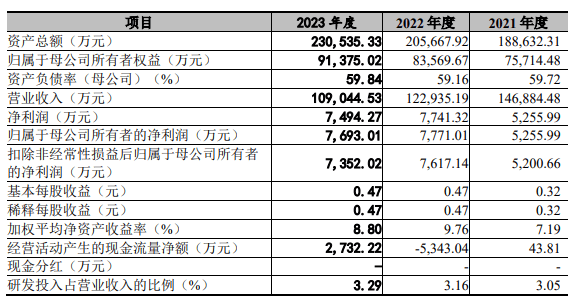2021年、2022年、2023年,发行人实现营业收入分别为14.69亿元、12.29亿元、10.90亿元;同期实现扣非归母净利润分别为5200.66万元、7617.14万元、7352.02万元。