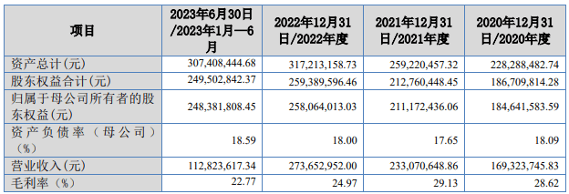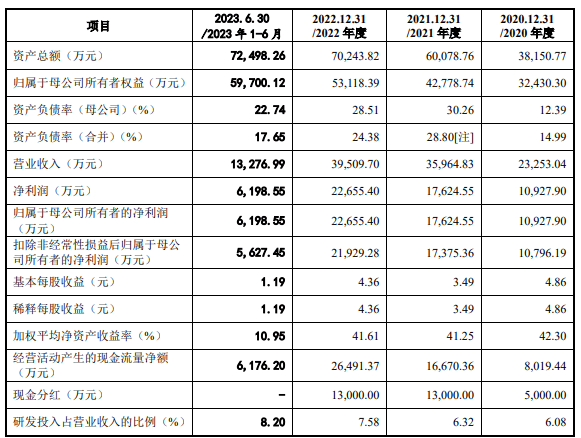 2020年、2021年、2022年、2023年1-6月,发行人实现营业收入分别为2.33亿元、3.60亿元、3.95亿元、1.33亿元;同期实现扣非归母净利润分别为1.08亿元、1.74亿元、2.19亿元、5627.45万元。