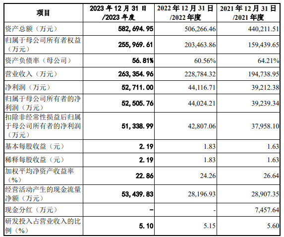 2021年、2022年、2023年,发行人实现营业收入分别为19.47亿元、22.88亿元、26.34亿元;同期实现扣非归母净利润分别为3.80亿元、4.28亿元、5.13亿元。